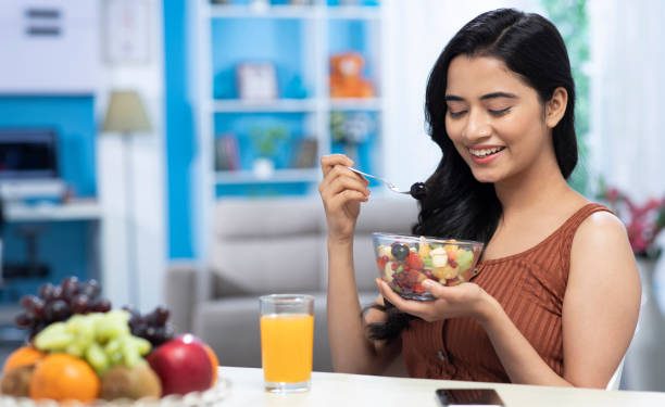 adult , adult only, young women , eating , fruit , salad, happy, India, Indian ethnicity,