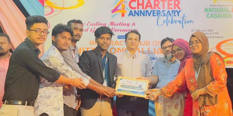 রোটার‌্যাক্ট ক্লাব অব চিটাগাং অ্যালায়েন্স-এর ৪র্থ চার্টার অ্যানিভার্সারি উদযাপন উপলক্ষে আয়োজিত এক বর্ণাঢ্য অনুষ্ঠানে নারী অধিকার ও সুরক্ষা বিষয়ক জাতীয় পর্যায়ের সংগঠন “Save Our Women” (SOW)-এর চট্টগ্রাম বিভাগ টিমকে বিশেষ সম্মাননা প্রদান করা হয়।