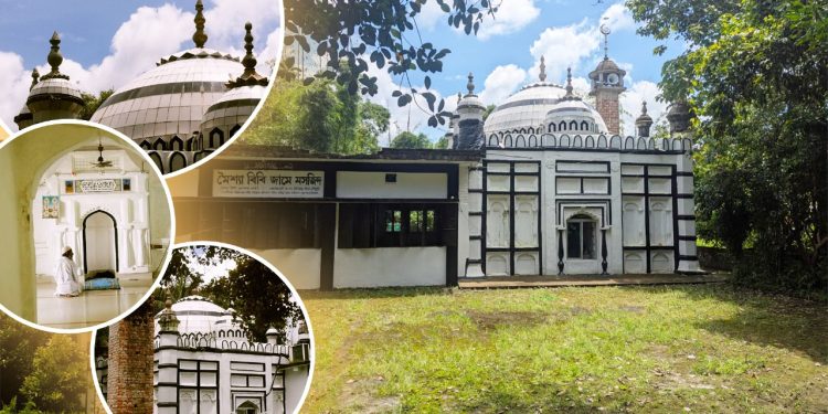 প্রায় আটশ বছর আগে নির্মিত এ মসজিদ কেবল নামাজের জায়গা নয়—এ যেন নারীর দৃঢ়তা, ঐতিহ্য আর ইতিহাসের সাক্ষী হয়ে দাঁড়িয়ে থাকা এক জীবন্ত দলিল। সাদা-কালো রঙে সজ্জিত, ছোট-বড় গম্বুজ শোভিত এই স্থাপত্যে এখনো স্পষ্ট পুরনো দিনের শিল্পরীতি। রয়েছে তিনটি প্রধান দরজা, দুটি জানালা আর পাশেই উঁচু মিনার।