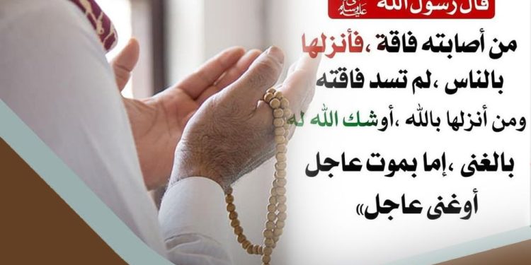 مَنْ أَصَابَتْهُ فَاقَةٌ فَأَنْزَلَهَا بِالنَّاسِ لَمْ تُسَدَّ فَاقَتُهُ. وَمَنْ أَنْزَلَهَا بِاللَّه أوشك الله لَهُ بالغنى إِمَّا بِمَوْتٍ عَاجِلٍ أَوْ غِنًى آجِلٍ